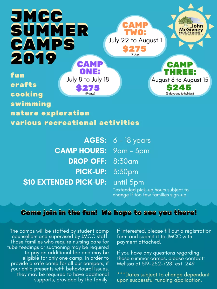 JMCC Summer Camps 2019 promotional graphic with John McGivney Children's Centre logo and invitation.