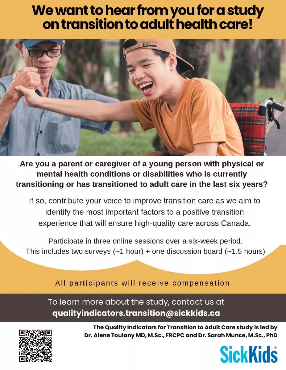 Call for study participation on transition to adult health care with young person in wheelchair.