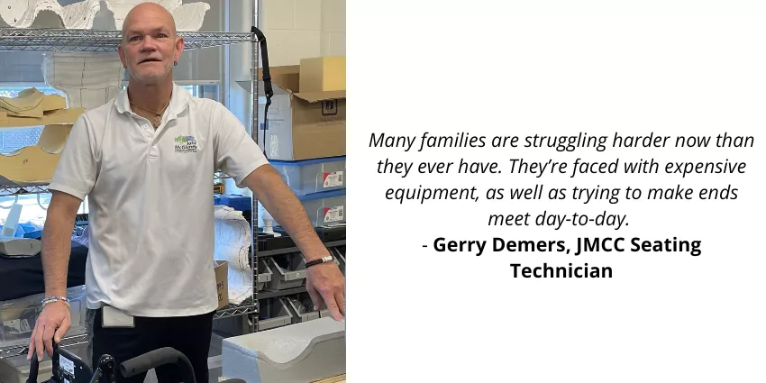 Gerry Demers has worked in the Seating & Mobility Clinic at JMCC for over 24 years. He has seen many changes, but two things he says haven’t changed: the relentless dedication of staff to help children and families, and the financial pressures our families face.